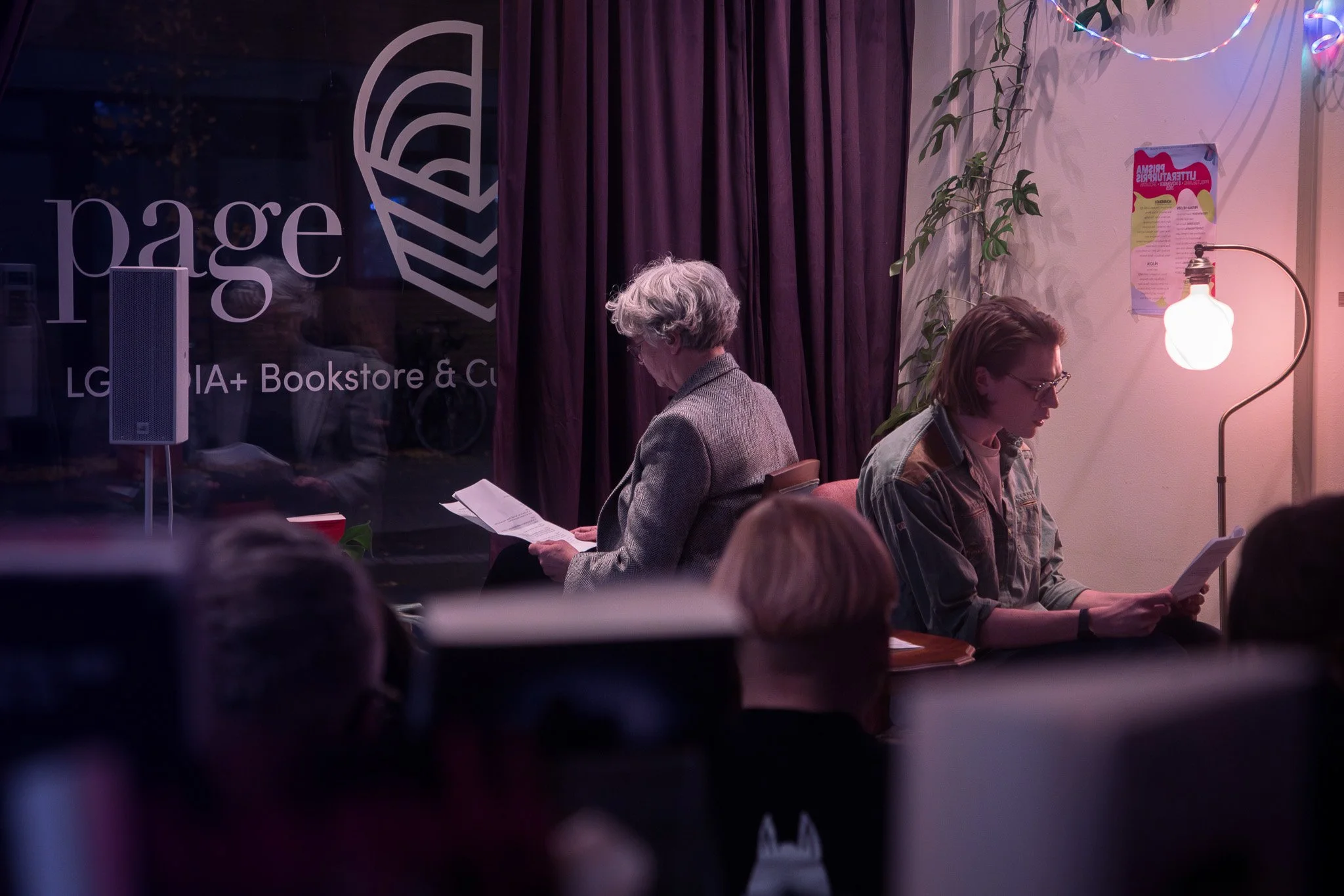 Ásdís Óladóttir och Mikko Kauppila läser A DISCUSSION ABOUT QUEER LITERATURE BY A VOLCANO på PAGE 28 den 7 november. Foto: Salomé Elliot.